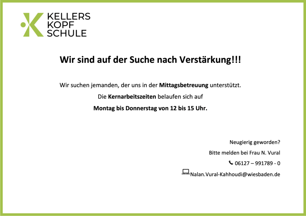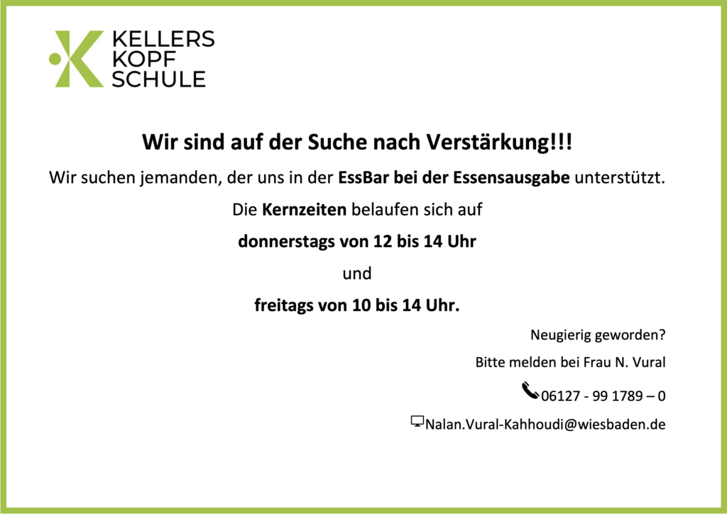 Wir sind auf der Suche nach Verstärkung für die Essensausgabe in unserer EssBar sowie für die Mittagsbetreuung der KKS. Bei Interesse wenden Sie sich bitte an Frau Vural.